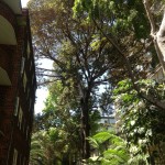 This fig, by comparison, has only a single and relatively straight trunk and has achieved a remarkable height and scale in this location. It is however largely hidden from public view due to the height of neighbouring development and surrounding trees.It is estimated at 28m in height with spread in excess of 20m. It has a trunk diameter at 1m above ground of 1.2m. It has had many of its lower branches pruned. It appears in good health and vigour.
