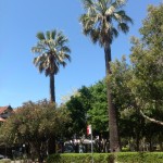 This pair of exotic American Cotton Palms (Washingtonia filifera) are believed to be remnants from a former large estate and garden. The palms have been retained within a recent park development scheme. This hardy, drought tolerant palm species is somewhat less common than its close relative, the Washington Palm (Washingtonia robusta).