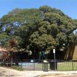 This Small-leaved Fig (Ficus obliqua) is located in a mulched area of enclosed playground near rear southern boundary fence. It’s canopy extends over the playground area and neighbouring properties. The root zone is likely to have a similar spatial extent.It measures approximately, height 16 metres, canopy spread 28 metres with trunk diameter 2.0 metres at one metre above the ground.
